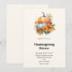 Convite de Ação de Graças com imagem temática de outono. Abóboras laranja e brancas cercadas por folhas de outono e flores alaranjadas-amareladas.