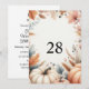 Convite de festa de aniversário minimalista com texto de caligrafia e fundo aquarela de folhas de outono e abóboras em cores neutras de outono.