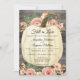 Um fundo rico de madeira de celeiro escuro destaca a abóbora branca e a rosa floral cor-de-rosa coral e pêssego com folhas brilhantes douradas para um design rústico, mas elegante, perfeito para um casamento em um dia de outono fresco! A arte foi pintada à mão por Audrey Jeanne Roberts. Conjunto completo disponível para coordenar. Direitos autorais.