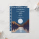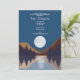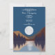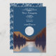 Uma bela design mostrando uma floresta, paisagem de montanha e lua de cheio refletindo na água. Os tons coloridos incluem tons neutros, como azul, marrom, bege e cinza. Um design rústico ideal para uma festa de aniversário rústica ao ar livre.