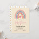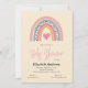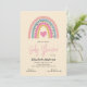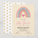 Um adorável convite de chá de fraldas perfeito para uma menina. O design apresenta um arco-íris fofo em tons de rosa, cor-de-rosa e ouro acentuados com um coração cor-de-rosa.