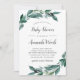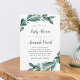 Os convites de chuvas botânicos para bebês elegantes apresentam uma paleta colorida de chic verde-floresta, preto-branco-escuro e branco-nítido. Os detalhes do seu chá de fraldas estão cheios de galhos verdes abundantes e folhas num estilo de aquarela pintada vibrantemente.