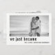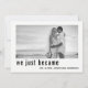 Este simples, mas elegante e minimalista anúncio de casamento e cartão de recepção do recem casados apresenta sua própria foto com um filtro Zazzle preto e branco aplicado, junto com o sentimento "Nós nos tornamos Sr. e Sra." na frente do cartão com tipografia de script com letras à mão, assim como seus nomes casados. A parte traseira dos convites apresenta a mesma foto com uma camada transparente e um filtro preto e branco, e as informações de recepção de casamento na parte traseira. Fácil de personalizar com sua própria foto e texto.