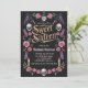 Convide seus convidados para uma celebração de Sweet Sixteen assustadoramente bela com este convite inspirado na academia sombria. O design gótico apresenta tipografia dourada impressionante contra um fundo preto profundo, acentuado com chaves antigas e corvos misteriosos. Este convite único define o clima perfeito para uma noite memorável e encantadora.