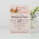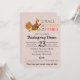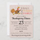 Convite Jantado de Ação de Graças para Turquia e Futebol, com um peru bonito correndo com um jogo de futebol em uma popular moda de linho com tipografia moderna em vermelho, marrom e laranja.