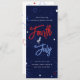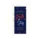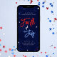 Celebrar o aniversário da América com este convite de festas de churrasco de quintal patriótico e divertido 4 de julho com fogos de artifício e estrelas num fundo azul escuro com tipografia vermelha branca e azul.