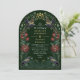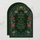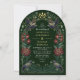 Elegante, caprichoso e gótico design de casamento perfeito para uma celebração encantada de temas florestais ou um caso gótico sangrento e escuro. Este design apresenta ravens colocados em uma moldura de videiras verdes, Snapdragons, Dahlias, bagas, verde e sotaques de ouro com um fundo verde escuro. Correspondência de Itens em nosso compro para um tema completo de festa.