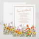 Cartão de Adiamento de Casamento Colorido com Flores Silvestres no Campo, o Amor é Paciente, apresenta lindas flores campestres em laranja, amarelo, roxo e rosa em um fundo branco com as informações de adiamento do seu casamento. Personalize editando o texto nas caixas de texto. Criado para você por Evco Studio www.zazzle.com/store/evcostudio