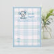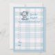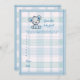 Cinzas Adoráveis e ursinho de bebê azul para o chá de fraldas de um garoto adivinhem aquele jogo de chá de fraldas de Comida de bebê. Cobertura de xadrez com borda pontilhada azul para fundo. Modelos fornecidas atrás.