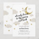 Este convite para chás de fraldas, giro e moderno, ilustra as nuvens desenhadas à mão, acentuadas com estrelas falsas de folha de ouro e uma lua. Perfeito para chás de fraldas, revelações de gênero ou aniversários.