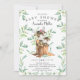 Convite para chá de fraldas bonito com alce doce, com a mãe sentada em um toco de árvore e enquadrada com folhas de cor verde-d-água naturais, colocadas sobre um fundo branco. Sacudir nosso convite para ver uma folha verde correspondente para um toque especial extra.
