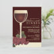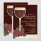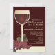 Uma bela taça de vinho de vinho tinto, feita à mão, é aninhada entre polos de uvas tinto deliciosos, um design perfeito para uma celebração de janto de ensaio com tema de vinho. Quando o casal adora vinho, se a festa ou o casamento é em um vinhedo, ou em um país de vinho, este design elegante vai dar o palco para uma bela celebração do grande evento que se avizinha. O copo de vinho é delicadamente sombreado e possui uma linda variedade vermelha, como uvas maduras, derramares sobre um fundo castanho de chocolate rico e profundo. Oferecida aqui no estoque básico de papel, este design também seria especialmente maravilhoso em linho ou feltro.