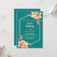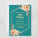 Um convite clássico e elegante de aniversário que inclui uma flor de laranja e folhas marrons com a tipografia do ouro moderna, num fundo teal.