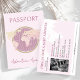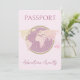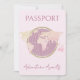 Convite para Chá de fraldas de Passaporte com viagem para bebê com fundo cor-de-rosa pastel, ilustração do globo com acento dourado e detalhes de eventos personalizáveis.
