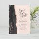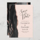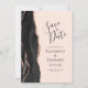 A borda esquerda deste elegante casamento moderno salve o cartão de data apresenta uma borda de agata preta, aparada com uma falsa rosa dourada. O texto personalizável combina letra preta de ardósia, letra copperplate e itálico em um fundo cor-de-rosa pincelado. O verso apresenta um design de agate preto e rosa dourado correspondente.