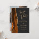 Este elegante e moderno salve a placa de data apresenta uma cor d'água laranja queimada e borda geode aparada com falso brilho dourado. O texto dourado aparece sobre um fundo preto-e-escuro. Substitua facilmente a imagem de amostra no lado oposto por uma foto vertical da futura noiva e noiva.