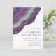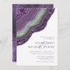 Nem todos os designs de casamento são criados iguais. Os layouts assimétricos para as peças neste impressionante conjunto de casamento provam que isso não é ruim! Bandas de cor onduladas em tons contrastantes de roxo violeta e verde com um centro de cristal brilhando formam um sotaque geode/agate na maioria das peças do conjunto. O reverso apresenta um fundo de abstrato de coordenação que lembra a pedra vedada com brilho. O convite de casamento mostrado aqui apresenta o acima mais uma modelo para adicionar os detalhes pertinentes do evento de casamento. Procure ID647 para ver todas as peças de coordenação neste conjunto.