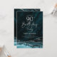 Convite de aniversário de 90 de gás lacrimogêneo e prateado. Elegante design moderno, com cor aquática turquesa agate marble geode background, faux glitter prata e script de tipografia. Trendy convida o cartão perfeito para uma comemoração de dia das mulheres na moda. Impressos convites Zazzle ou modelo de impressão digital instantânea para download.