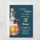 A modern birthday party invitation with bold numbers, a bottle of whiskey and a glass of whiskey. Customize the details for a unique and cool birthday celebration.