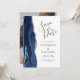 Este elegante e moderno salve a placa de data apresenta uma cor d'água azul marinho, borda agitada com falso brilho prateado. O texto personalizável é uma cinza de carvão em um fundo branco. Substitua facilmente a imagem de amostra no lado oposto por uma foto vertical da futura noiva e noiva.