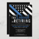Este design apresenta uma bandeira da polícia com listras pretas e brancas, e uma fina faixa azul de linha também. O texto "A lenda está se aposentando" se senta acima de todos os detalhes partidários para os detalhes do polícia aposentado, xerife, capitão ou chefe do partido aposentado.