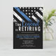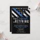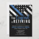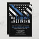 Este design apresenta uma bandeira da polícia com listras pretas e brancas, e uma fina faixa azul de linha também. O texto "A lenda está se aposentando" se senta acima de todos os detalhes partidários para os detalhes do polícia aposentado, xerife, capitão ou chefe do partido aposentado.