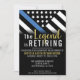 Este design apresenta uma bandeira da polícia com listras pretas e brancas, e uma fina faixa azul de linha também. O texto "A lenda está se aposentando" se senta acima de todos os detalhes partidários para os detalhes do polícia aposentado, xerife, capitão ou chefe do partido aposentado.