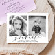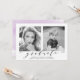 Nossa festa de formatura de fotos "Agora e Depois" na na moda convida a exibir sua foto favorita do mais velho (agora), assim como uma foto de bebê ou criança (então). Alterar os anos abaixo de cada foto para refletir o ano de graduação e o ano de nascimento (ou a foto do ano foi tirada). Os convites de festa de formatura modernos exibem "formando" em uma fonte elegante com o nome do formando, o nome da escola e o ano de classe abaixo. O verso dos convites de festa de formatura de tendências apresenta os detalhes de sua parte em um plano de fundo de cor d'água roxo.