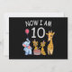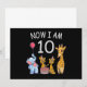 Feliz aniversário de 10 anos. Design divertido e adorável de aniversário infantil com um elefante fofo, dois furões e uma girafa celebrando seu aniversário no zoológico.