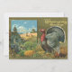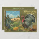 Ilustração antiga de imagem de feriado de Ação de Graças com um peru e uma fazenda durante os meses de outono. Legumes, abóboras, palha, medas de feno no campo e folhagem. Texto "Saudações de Ação de Graças".
