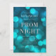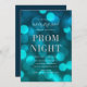 Convite de baile elegante com as palavras "Noite de Baile" em folha de prata falsa contra um fundo de luzes bokeh azul aqua. O convite tem um verso com fundo azul escuro.