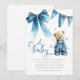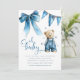 Crie o cenário para uma celebração alegre com esses convites de chuveiro de bebê temáticos de bebê de jeans azul. Com um ursinho adorável em macacão de ganga, um laço de ganga doce e estrelas azuis divertidas espalhadas por um modelo de convite moderno, eles são perfeitos para homenagear os futuros pais.