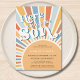 Você está planejando o chá de fraldas de um menino? Este convite colorido para chá de fraldas de um rapaz com temática solar mostra "Aqui Vem O Filho" em retrorgrafia em um fundo de explosão solar. Facilmente personalizável.