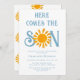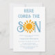 Convide a família e os amigos para o seu chá de fraldas com este convite para chás de fraldas de rapazes temerários. Apresenta o texto "Aqui Vem o Filho" em tipografia azul com um sol amarelo brilhante. As costas estão decoradas com um padrão solar. Facilmente personalizável. Original Watercolor © Michele Davies.