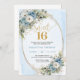 Celebrate a milestone moment with this elegant Sweet Sixteen invitation, featuring a refined watercolor design of dusty blue florals blended with soft white flowers and fresh eucalyptus greenery. Framed by a shimmering gold glitter border and paired with graceful script lettering, this invitation sets a sophisticated tone for a truly unforgettable Sweet Sixteen, Sweet 16th, or 16th birthday celebration.
