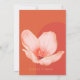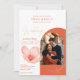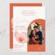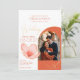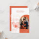 Um convite moderno para o casamento, com o texto laranja brilhante da tendência e detalhes em vermelho de toranja. Esta sombra de laranja chama-se Verona Sunset. Detalhes em ouro falso, uma silhueta de uma flor delicada. Tipografia moderna e fotografia em forma arquivada.