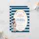 Há uma oval branca com uma borda dourada com texto no seu interior. O texto está escrito em letras maiúsculas douradas, exceto o nome, que é azul-marinho. O título "Ahoy! É um menino!" está curvado acima do restante. O fundo tem listras azuis-marinho e brancas ao estilo marinheiro.