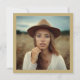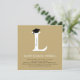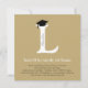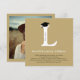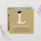 Este design clássico e simples de cartão de convite para festa de formatura em ouro e branco apresenta uma letra 'L' em monograma negrito do formando com um birrete / chapéu de formatura como um destaque.