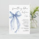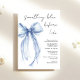 Chá de panela chic com uma delicada cor d'água arco azul-coquete, "algo azul antes de mim" em um roteiro de caligrafia moderno, e o nome e detalhes do chá da noiva em letras simples.