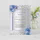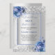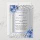 Fundo de aspecto fino prateado decorado com rosas azuis, flores e confete. Personalize e adicione um nome e detalhes da parte. Letras negras. Texto: Algo azul antes de mim.