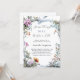 Um fundo branco elegante, decorado com flores silvestres cor-de-rosa e azuis e uma fita azul. Personalize e adicione um nome e detalhes da parte. Texto: Algo azul antes de mim.