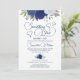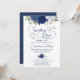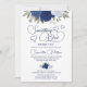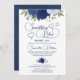 Este belo chá de panela apresenta um design bócio rústico com rosas de aquarela pintados manualmente em tons de azul empoeirado, marinho e índigo. O título diz "Algo Azul antes de Eu Escrevo em elegantes escritos em letras modernas com flores, pântanos e corações românticos bonitos. Há espaço para RSVP e informações de registro. É uma forma maravilhosa de celebrar a noiva!