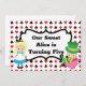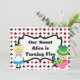 Bonita Alice no País das Maravilhas convida para um aniversário infantil. Alice no seu vestido azul e o Mad Hatter sentam-se em cima de um padrão de baralho em vermelho e preto com espadas e símbolos de diamante. Personalize com os detalhes da festa do seu filho na parte de trás do cartão legal.