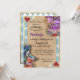 Este convite cômico apresenta um tema colorido do chá de conto de fadas Alice no País das Maravilhas. Uma imagem do Gato de Cheshire é ilustrada no canto superior direito. O chapéu de Mad Hatter e uma pilha de equipes são colocados no canto inferior esquerdo. O plano de fundo apresenta um padrão de harlequin azul pálido com uma estrutura dourada. Dois corações vermelhos são colocados em cantos opostos para se assemelharem a um cartão de jogo.