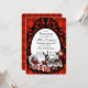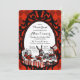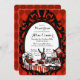 Convites de chá de panela com um tema Alice no País das Maravilhas em cores vermelha e preta.