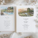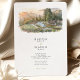 This two-sided destination wedding invitation features a fine-art watercolor illustration of the Alila Ventana Big Sur resort perched on the hillside above the California coast. The artwork captures an elevated view of the infinity-style pool, terraced decks, and modern cedar-clad buildings nestled among redwoods and rolling mountains at sunset. Soft washes of misty blue, warm gold, and muted green blend together in a loose, painterly style, while delicate ink outlines define the architecture and landscape, giving the design a relaxed yet luxurious feel.