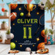 Celebrate your little athlete with this bold all-star sports design featuring a trophy, tennis racket, and game balls on a dark navy background. Perfect for active birthday fun!
