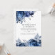 Convites de almoço de damas de honra com flores azuis e brancas com acentos de folha de prata.
