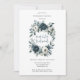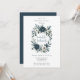 Um casamento sofisticado com uma coroa floral em aquarela azul-marinho adornada com peônias exuberantes, rosas e folhagens de eucalipto em tons de azul-marinho, verde e marfim. O design é aprimorado por uma caixa impressa em cinza-prateado sob a coroa com layout de texto em fonte moderna. O verso do convite continua o tema com um arranjo floral correspondente para uma aparência coesa e elegante. Perfeito para casais que buscam papelaria de casamento atemporal e sofisticada.