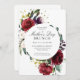 Celebre a Mamãe com este convite exclusivo de almoço do Dia das Mães em aquarela floral. Possui uma adorável moldura floral circular com buquês de rosas na combinação de cores elegante de vermelho burgundy, branco, roxo ameixa com folhagens espalhadas por toda parte. Personalize o modelo de texto com as informações do seu evento. Este convite está disponível tanto como convite impresso quanto como download digital para enviar eletronicamente aos seus convidados.